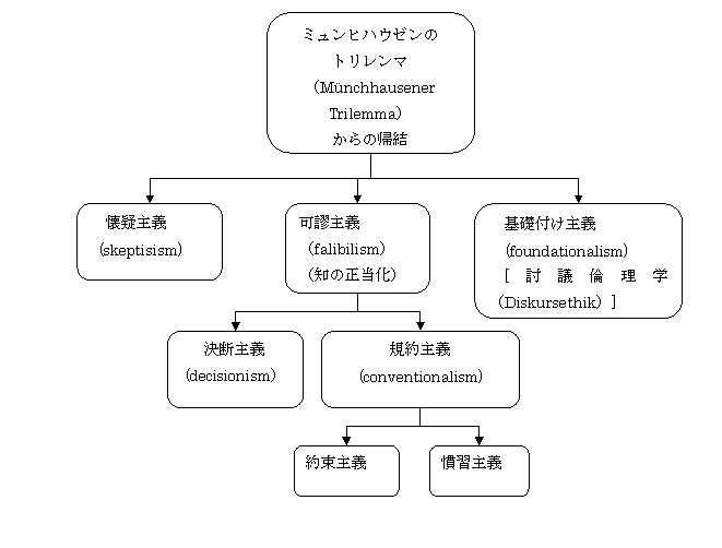 つまり、「究極的に根拠付けられた知は存在しない。それゆえに、そもそもいかなる知も存在しない」ことになる。これは懐疑主義と呼ばれる立場である。
